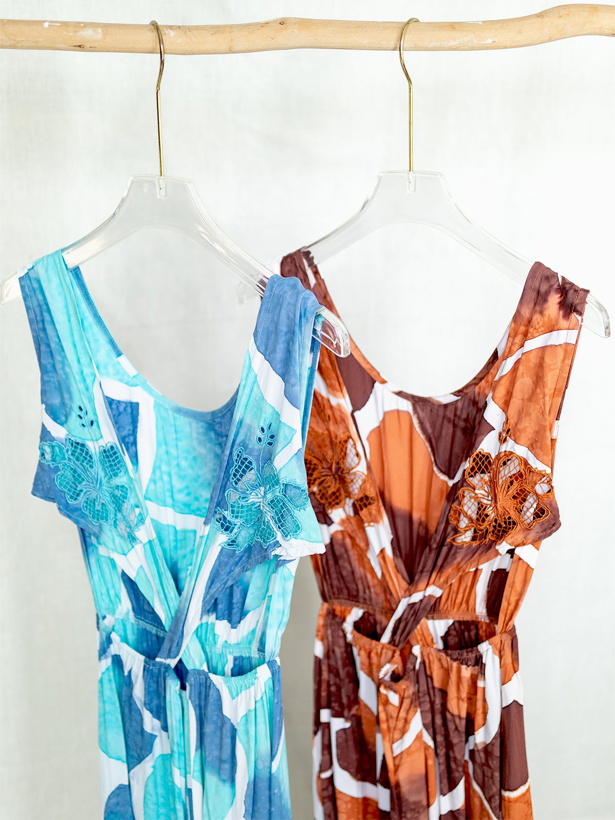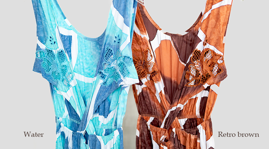 生地は2種類で、厚めの無地コットンと、職人の手描きモチーフのレーヨン。