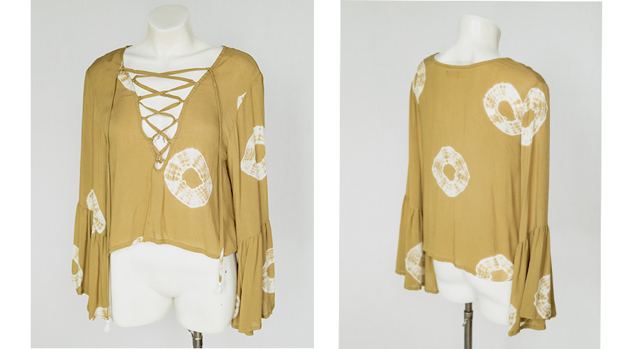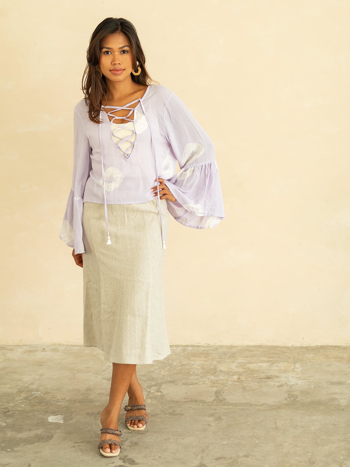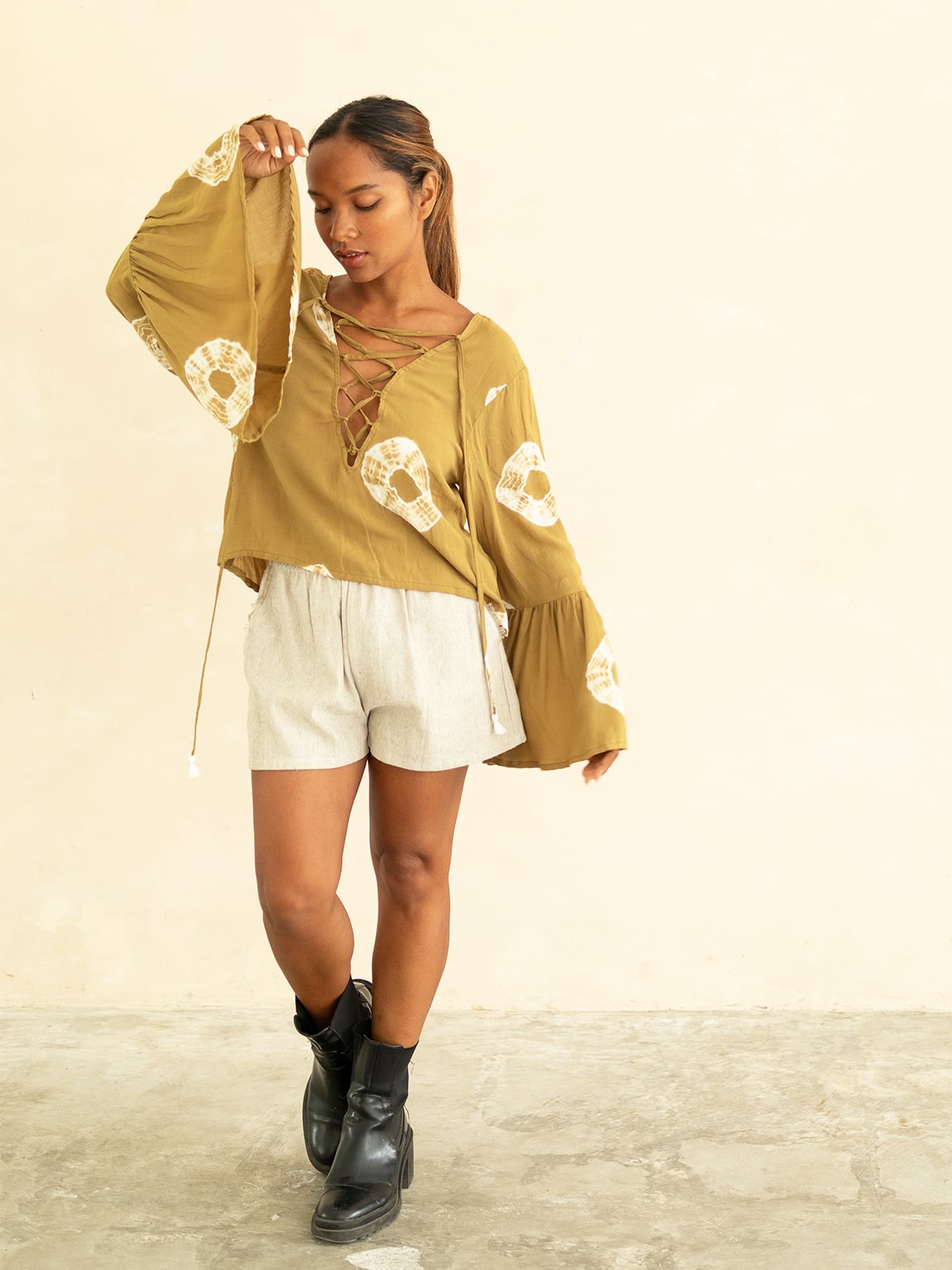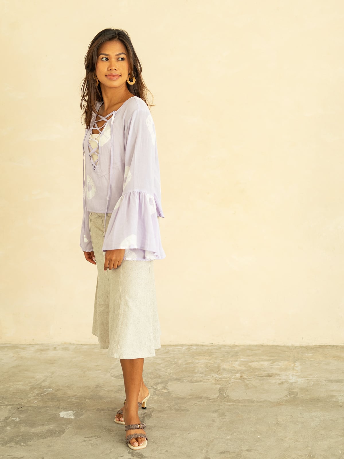 たっぷり生地を使ったフリル袖、タッセルのついたレースアップフロント。