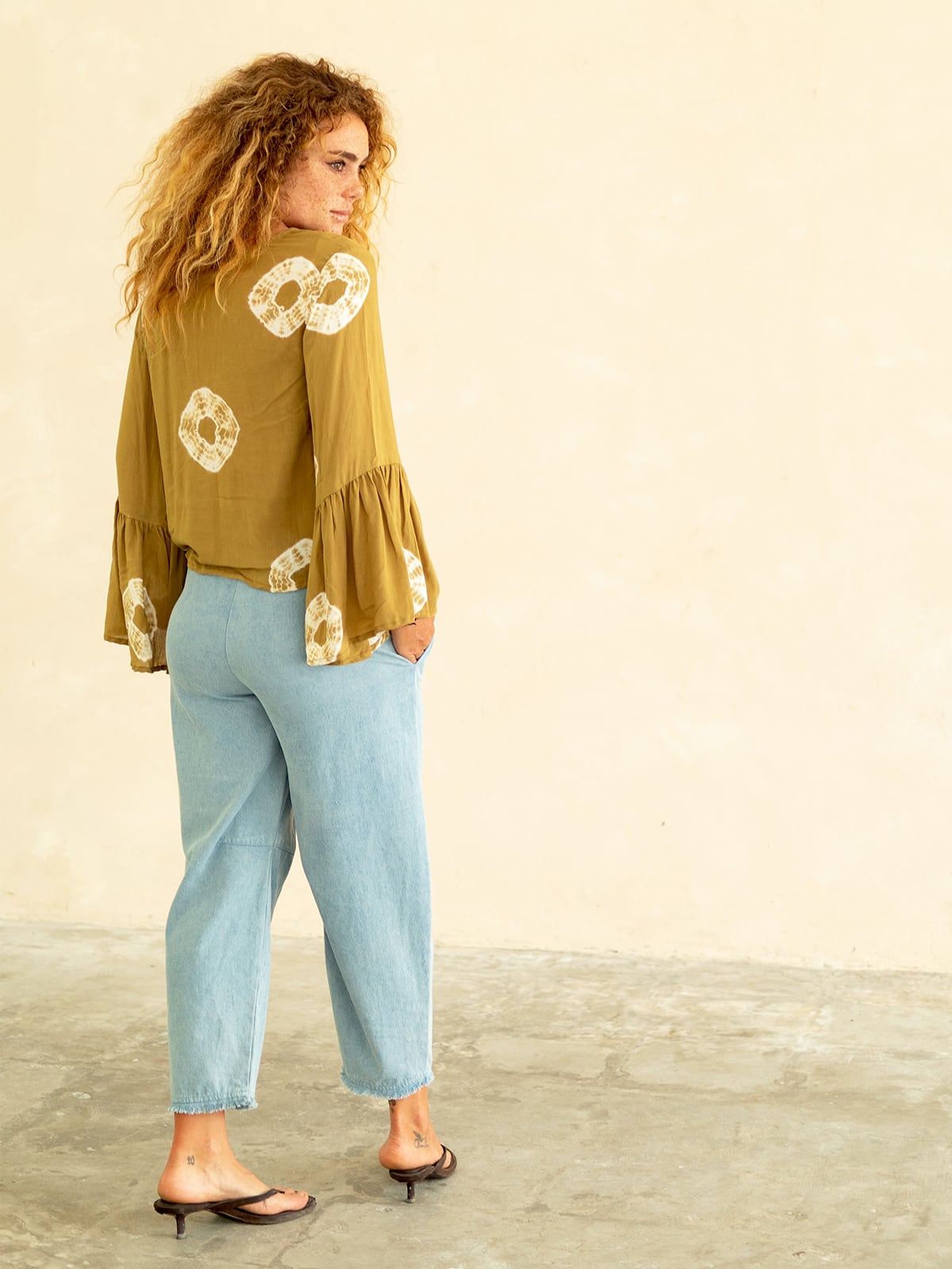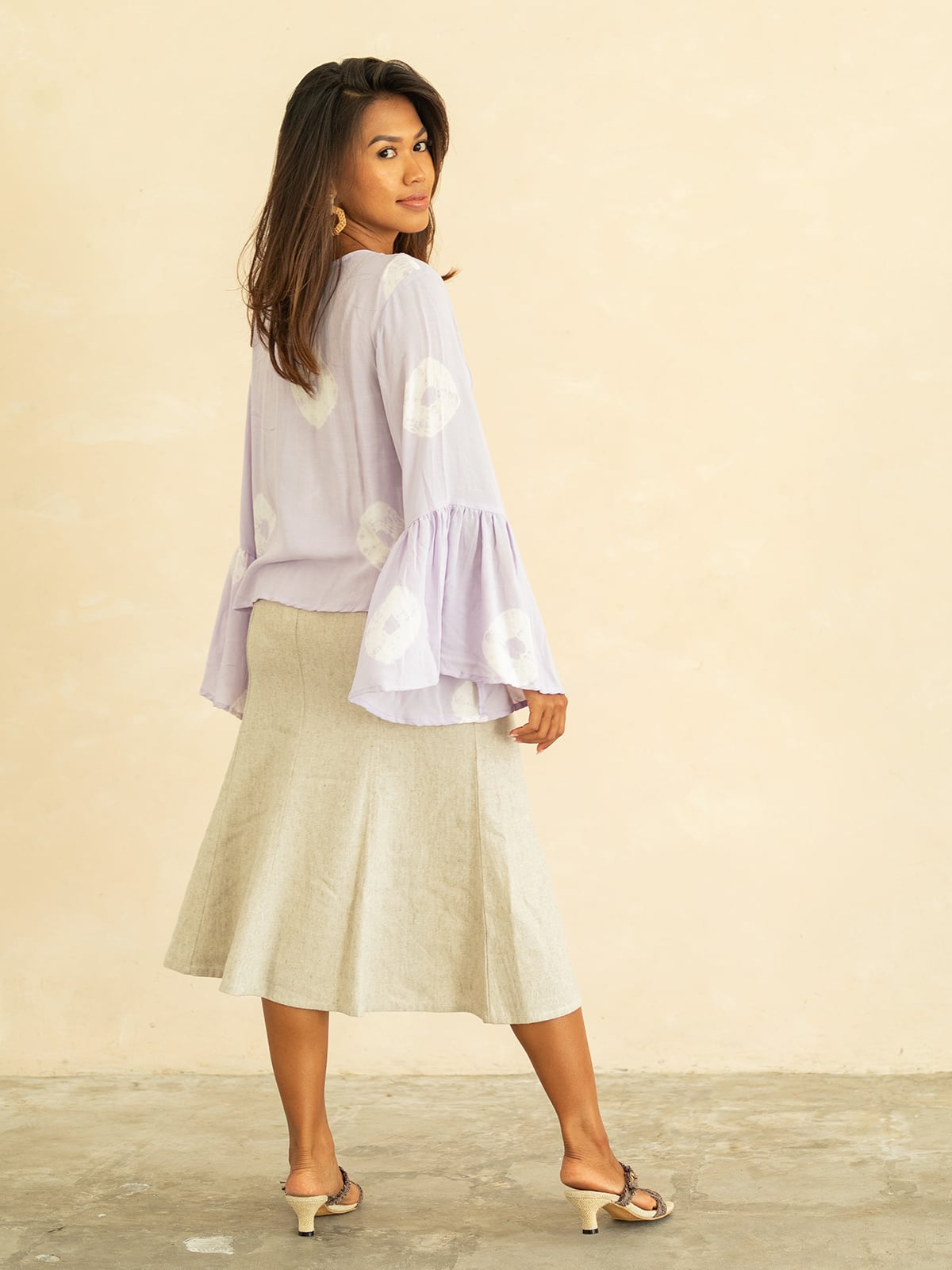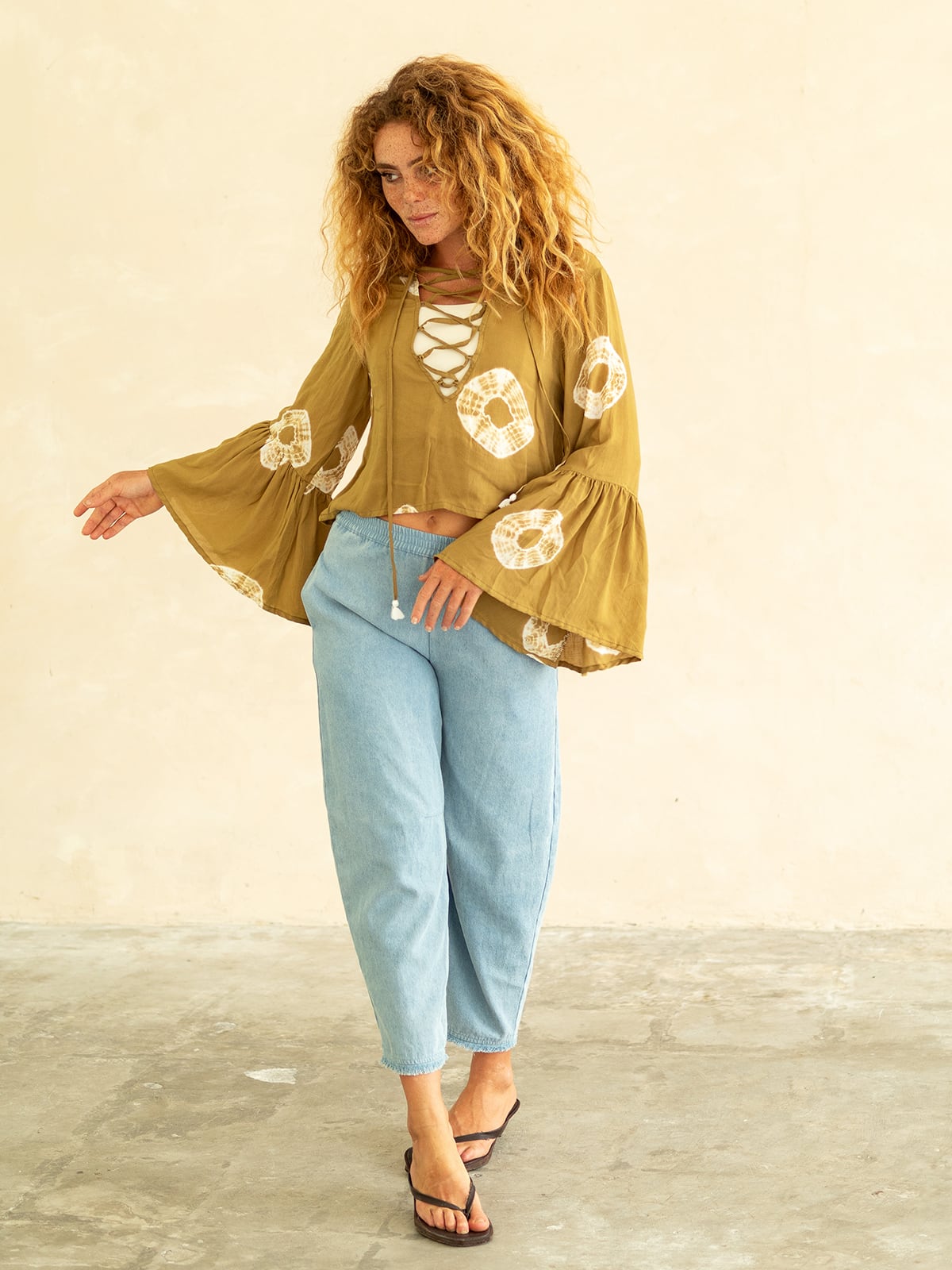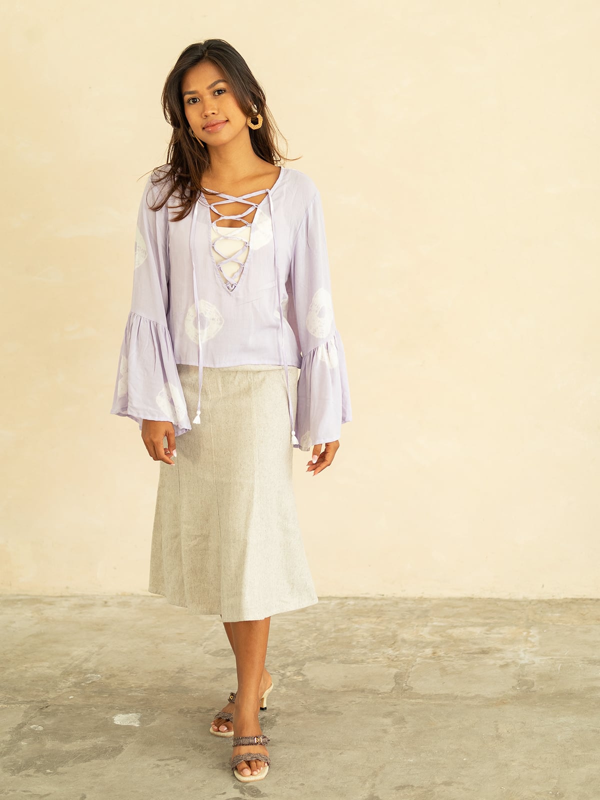 たっぷり生地を使ったフリル袖、タッセルのついたレースアップフロント。