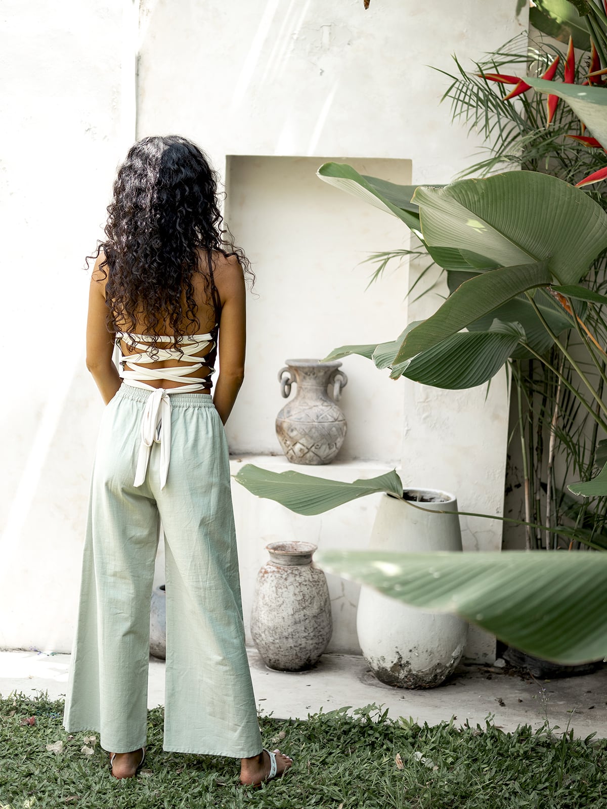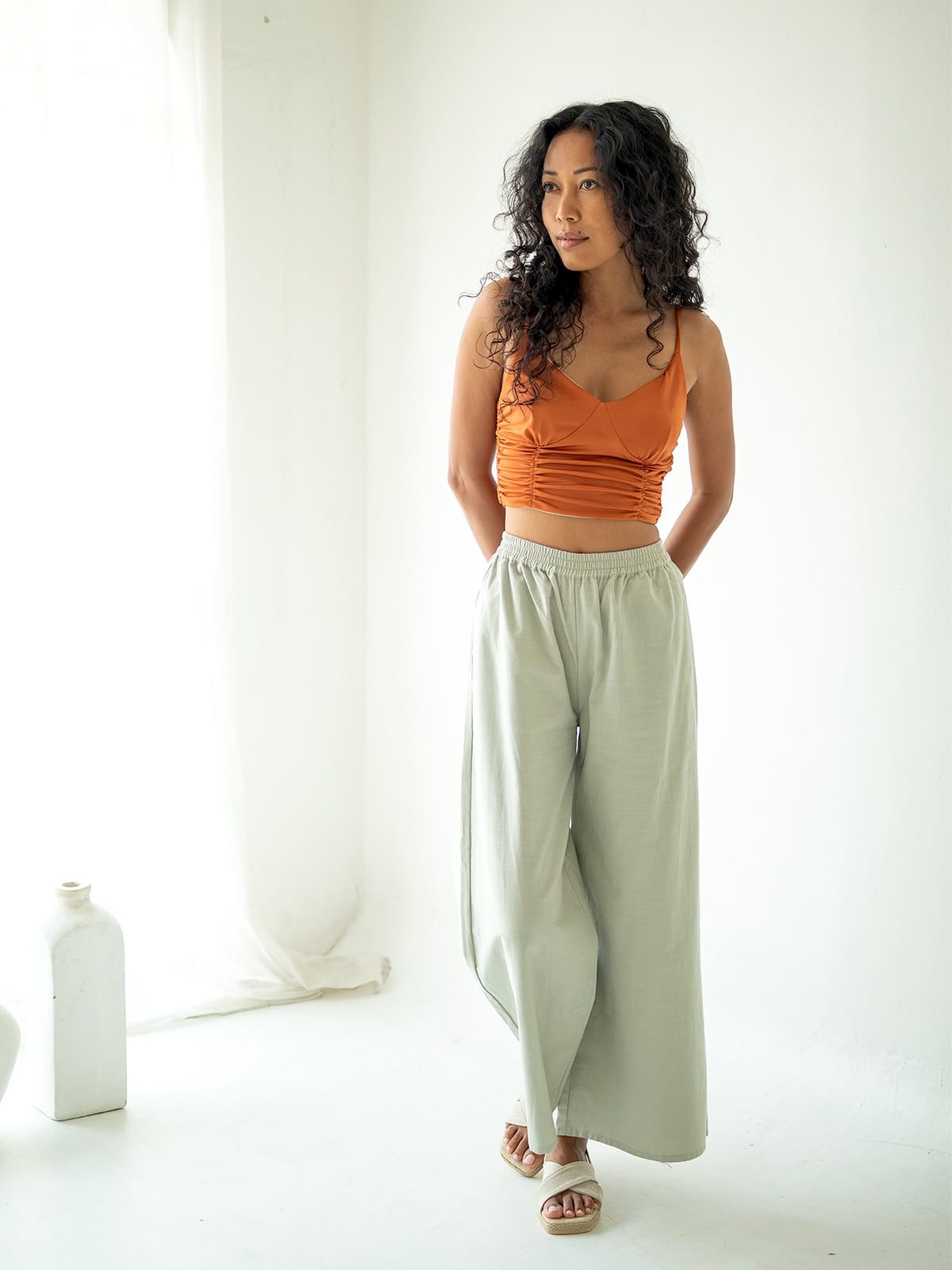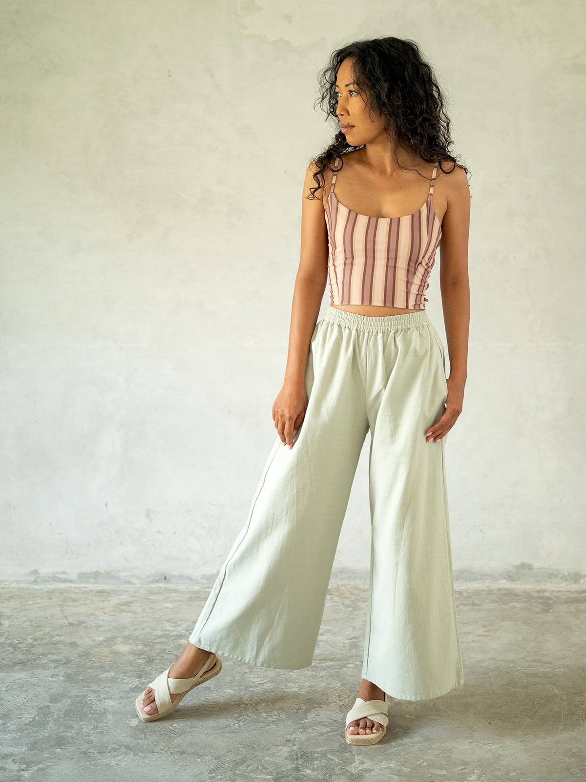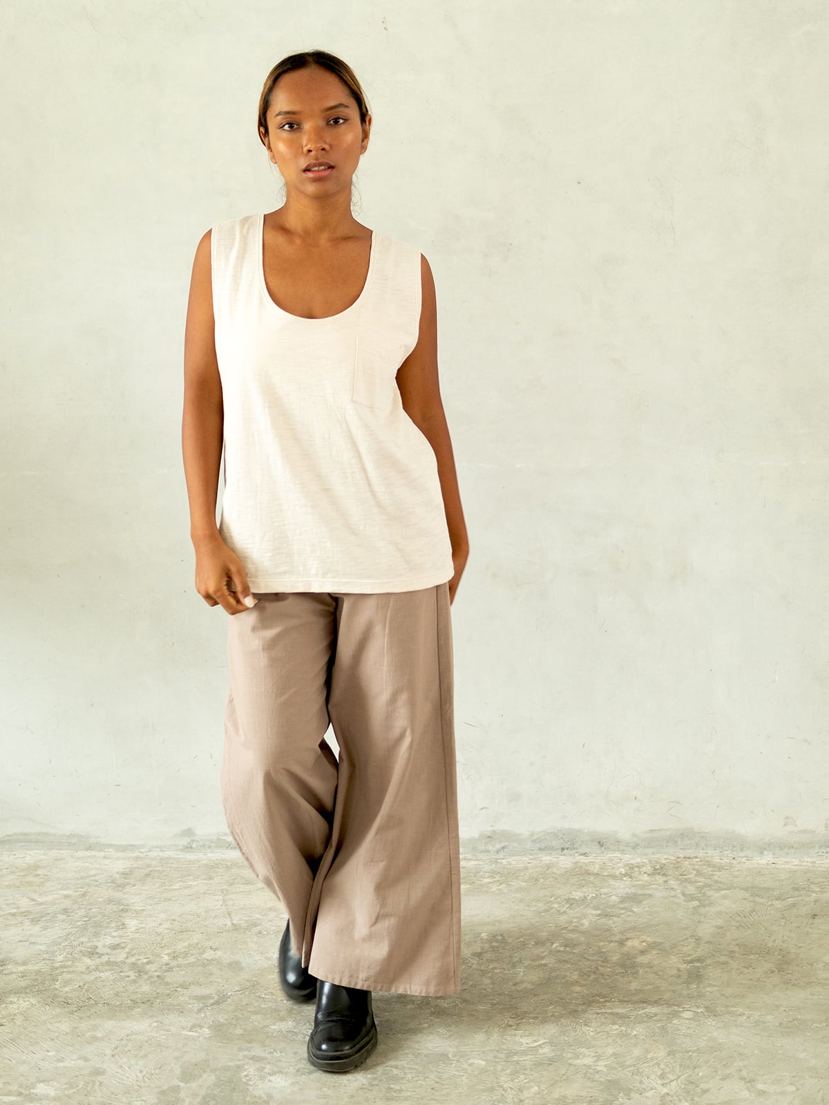 シンプルなデザインのワイドパンツ。