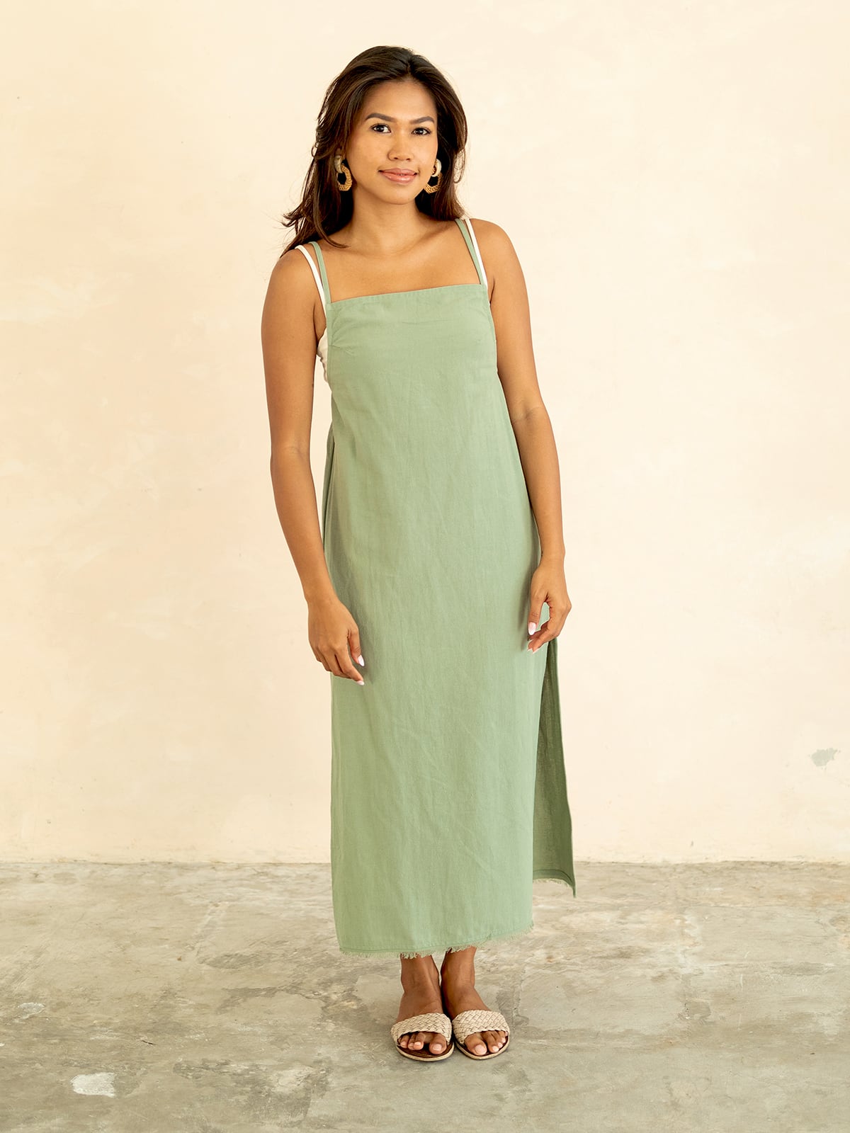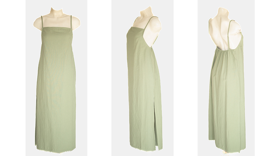 動きやすさを兼ね備えてロングスリットにし、裾にフリンジを施しました。