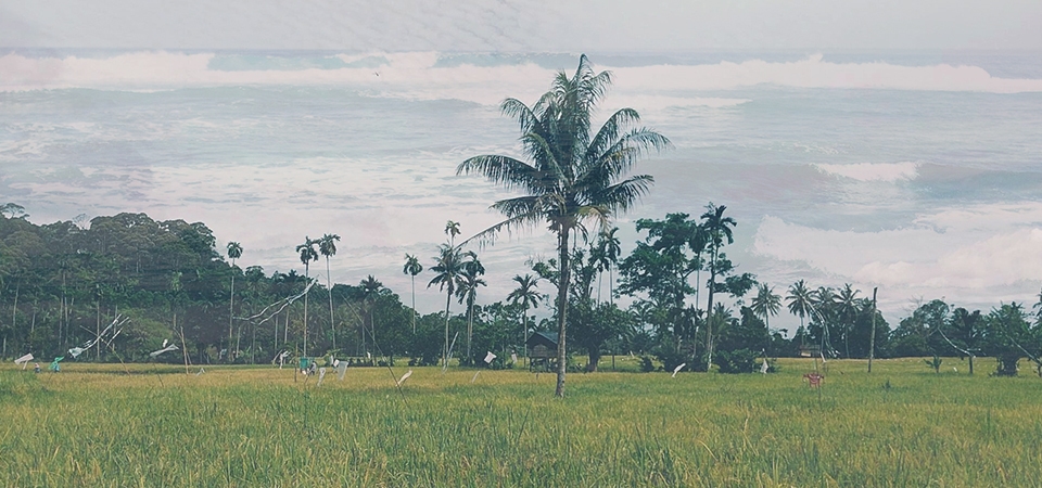 ココナツの景色がある田んぼの細道をドライブ。