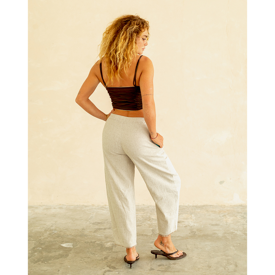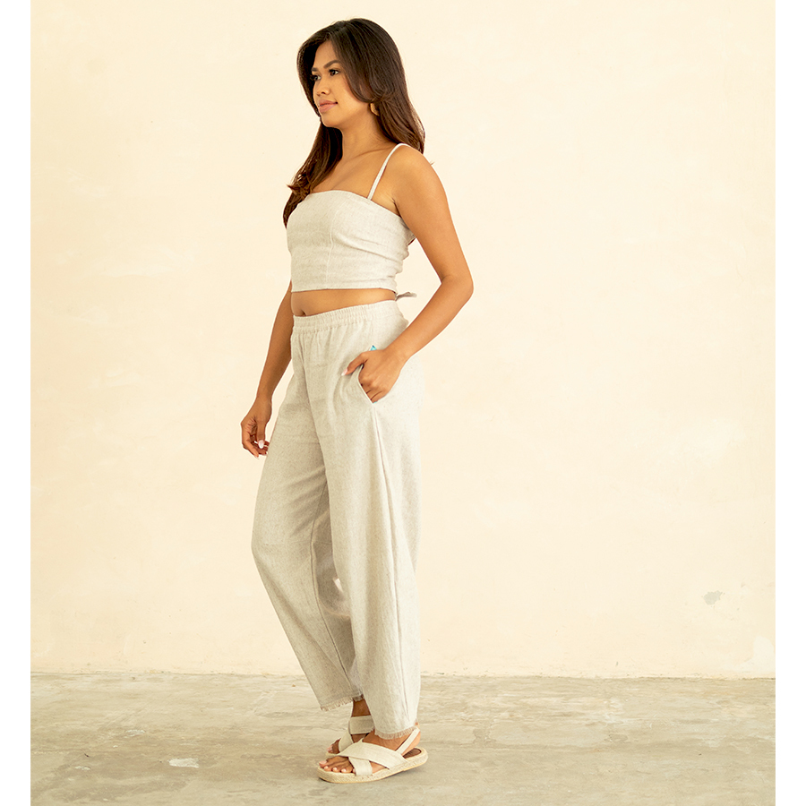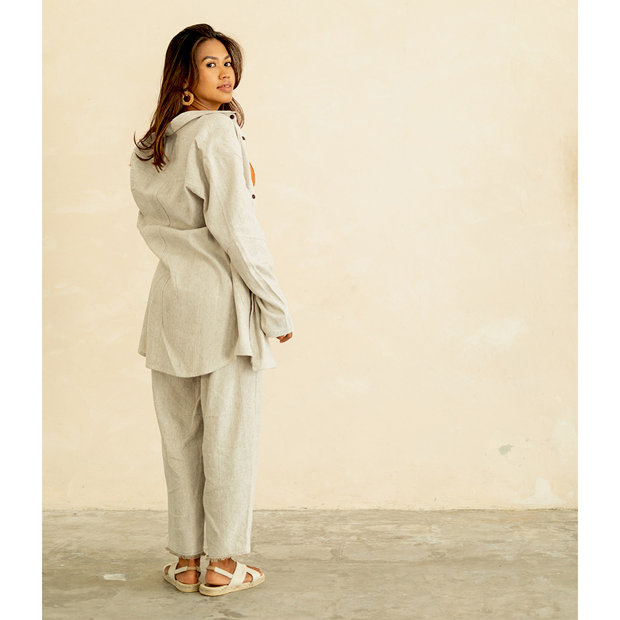 DENIM織のLINENで、多少厚みがあり、固めの表情あります。