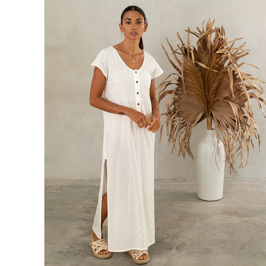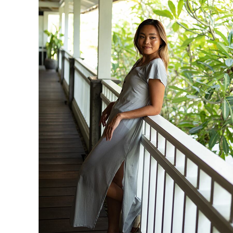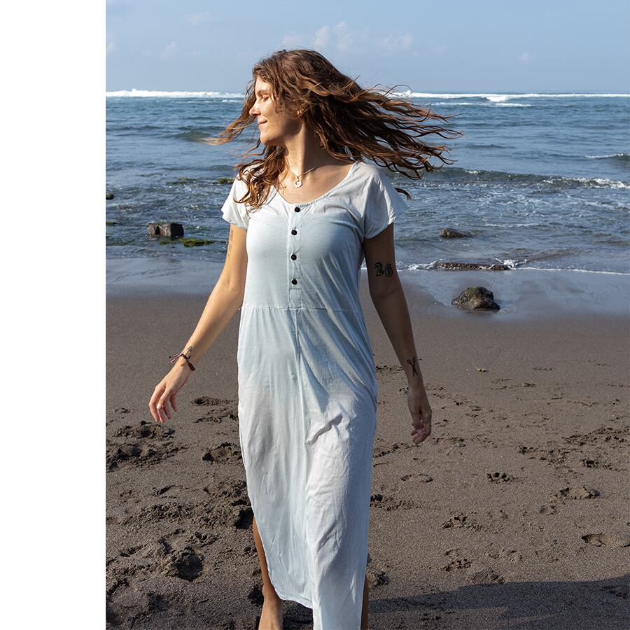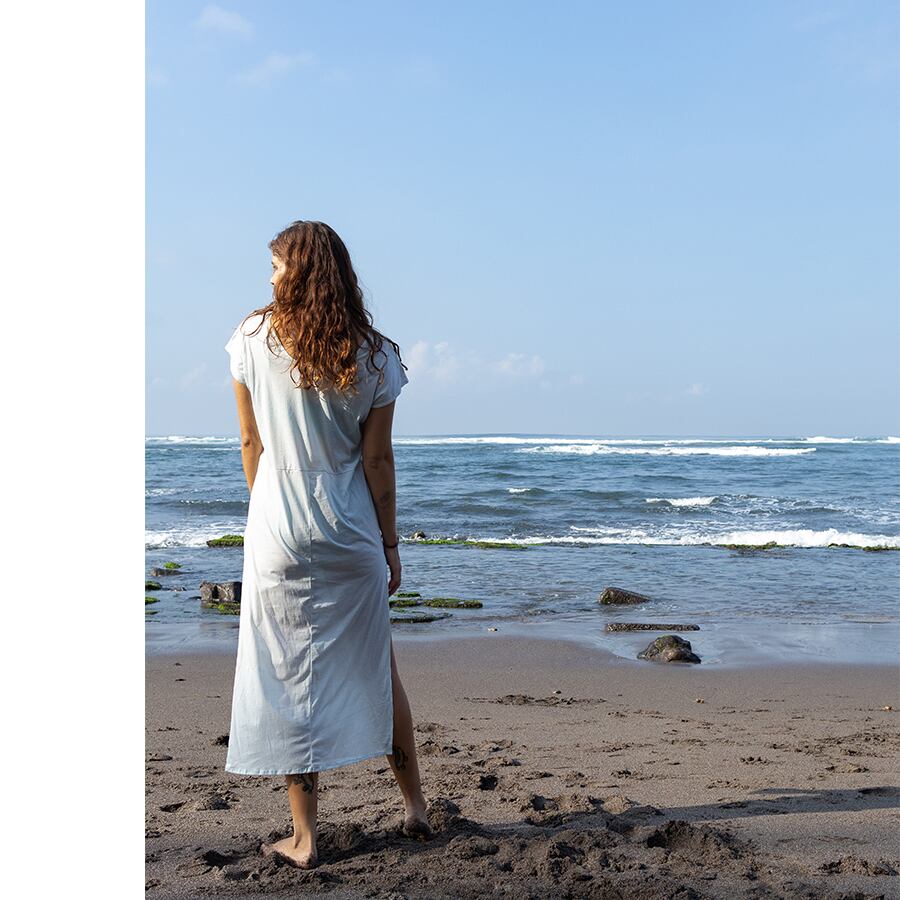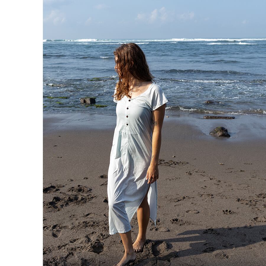 薄くて軽い、透け感のある素材の、海やリゾートで着るロング丈ワンピース。