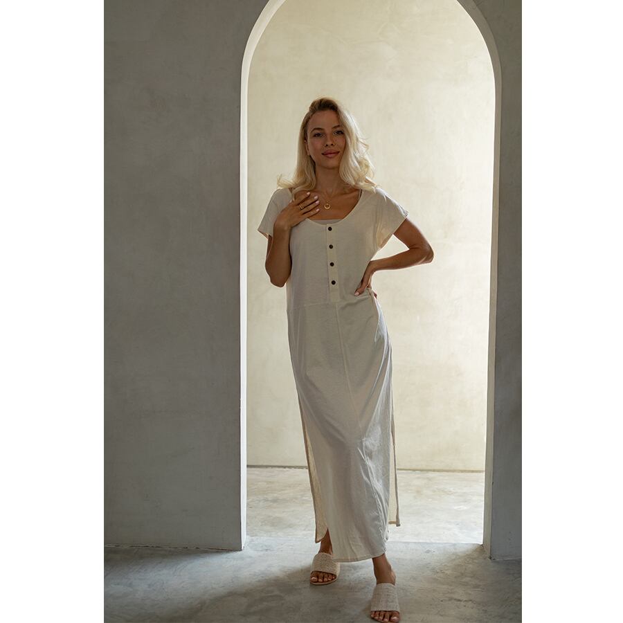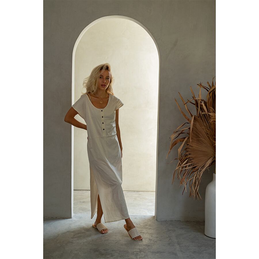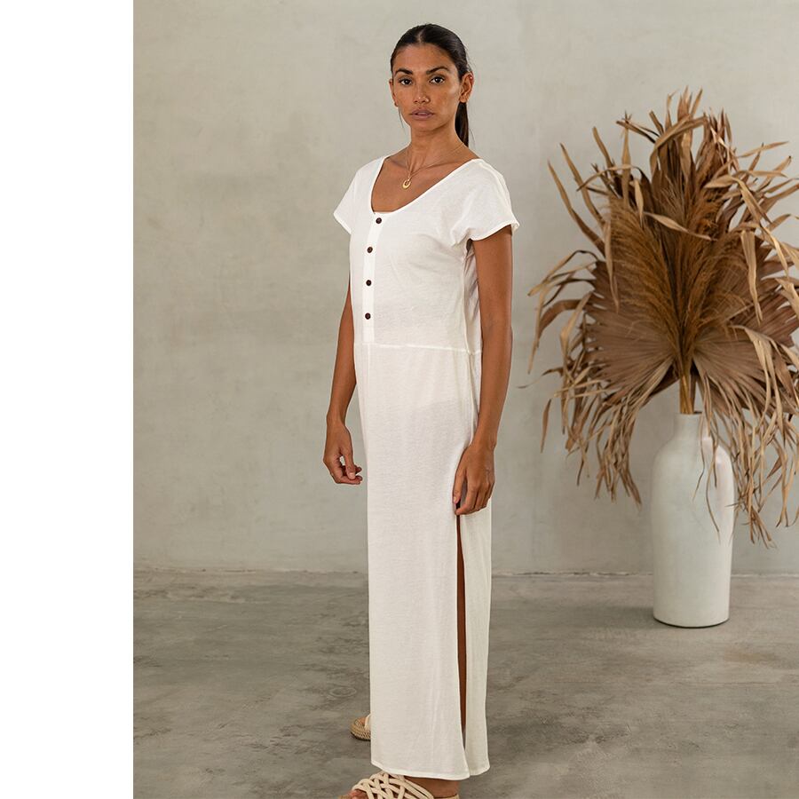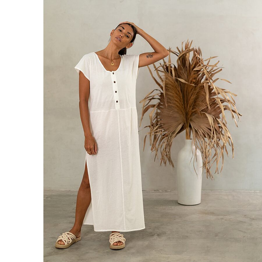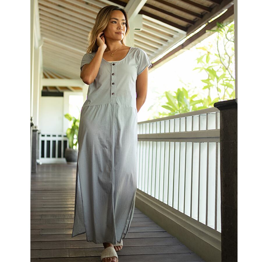 薄くて軽い、透け感のある素材の、海やリゾートで着るロング丈ワンピース。