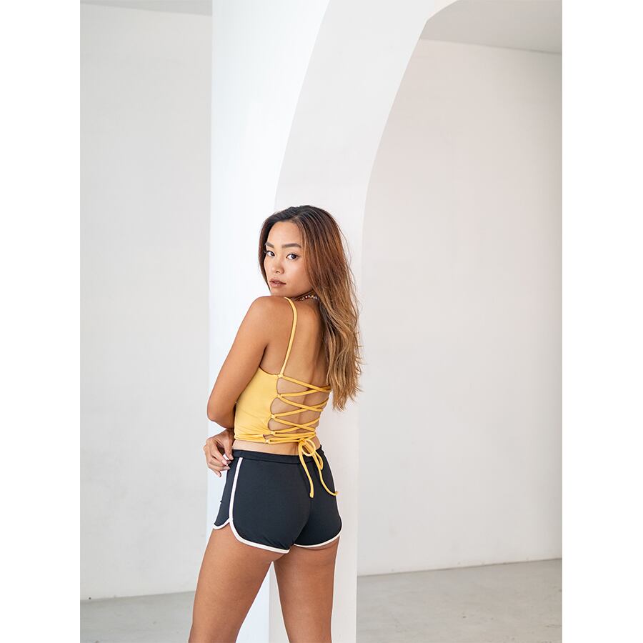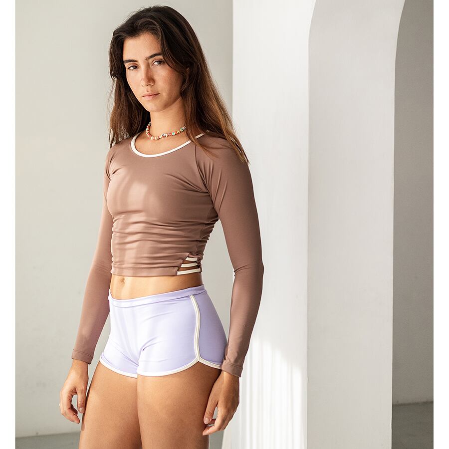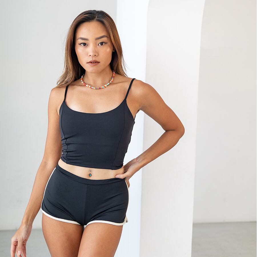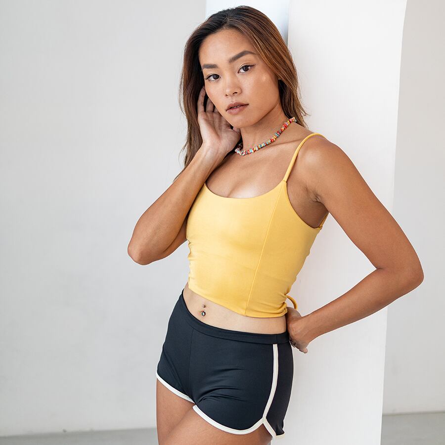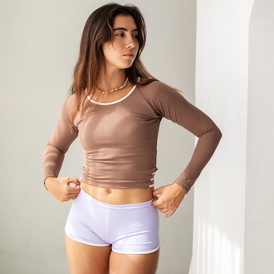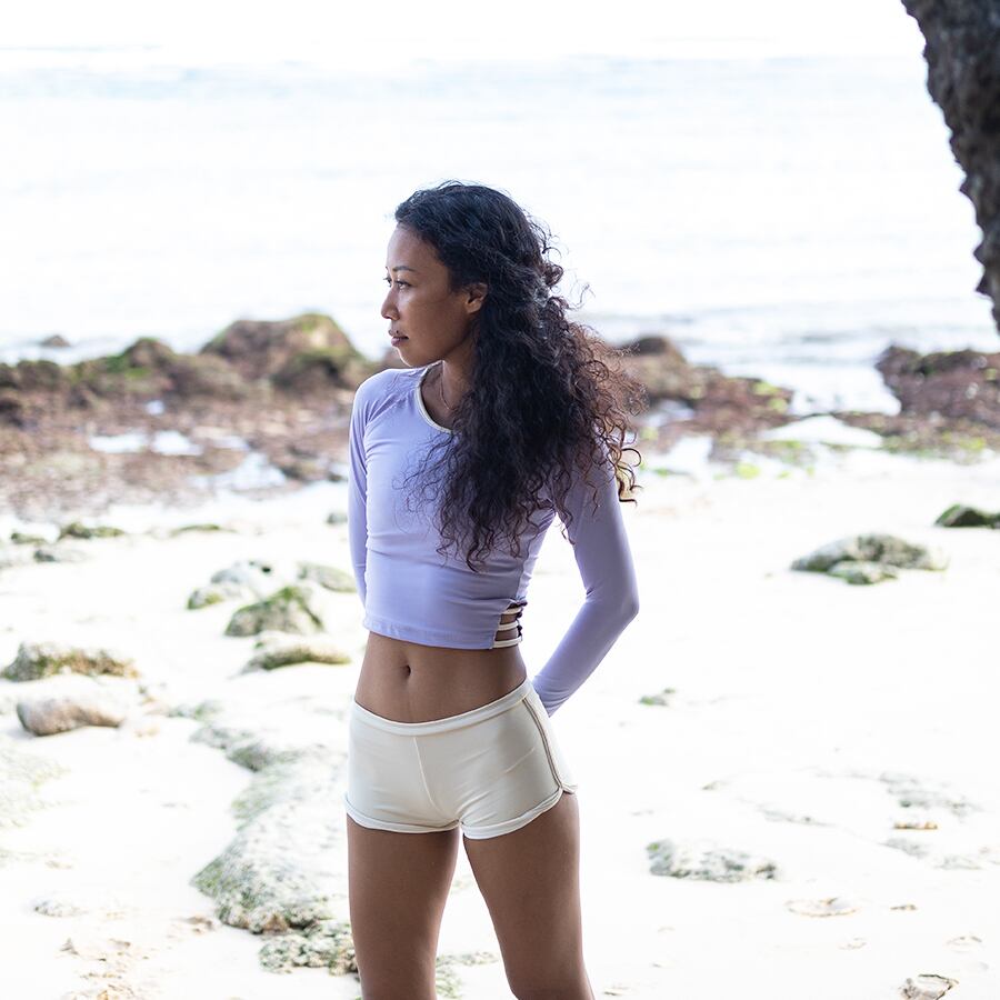 パイピングデザインのロングスリーブとの相性は抜群ですが、クロップドトップスともかなり合うし、敢えて、トライアングルなどでセクシーに着こなすのもおススメ。