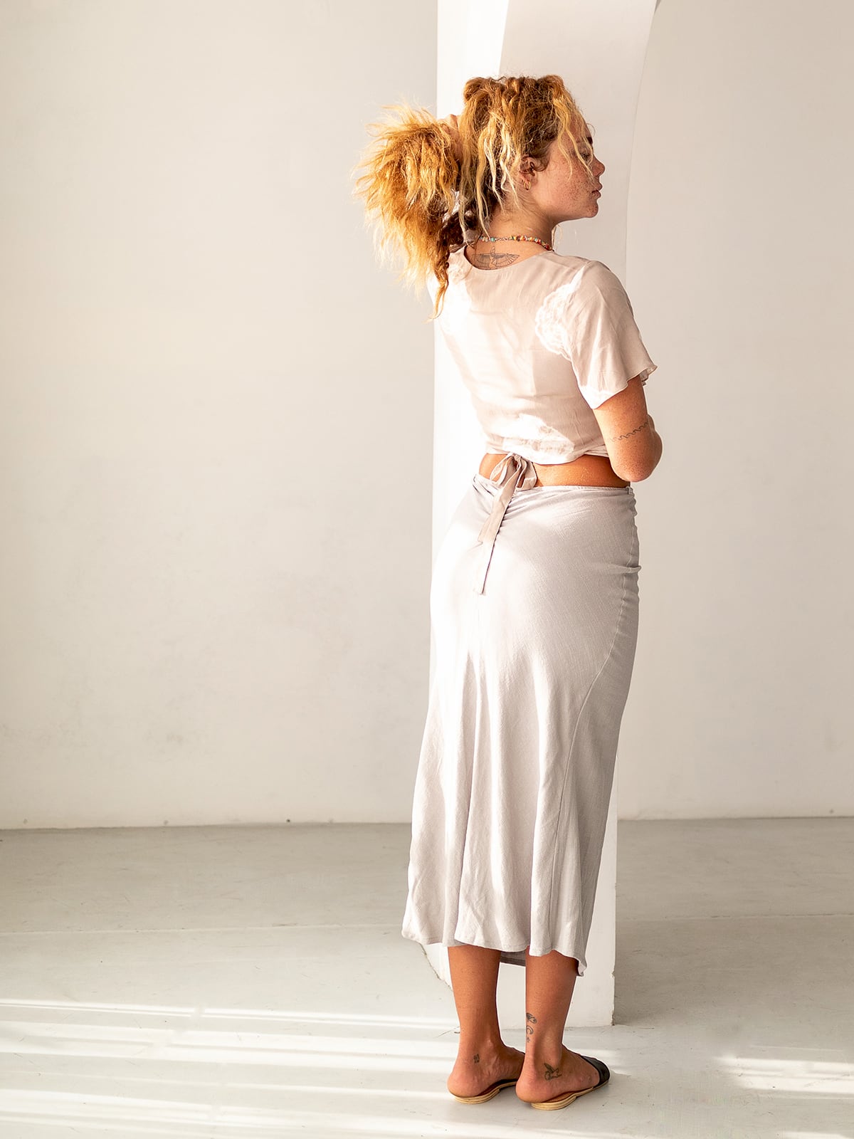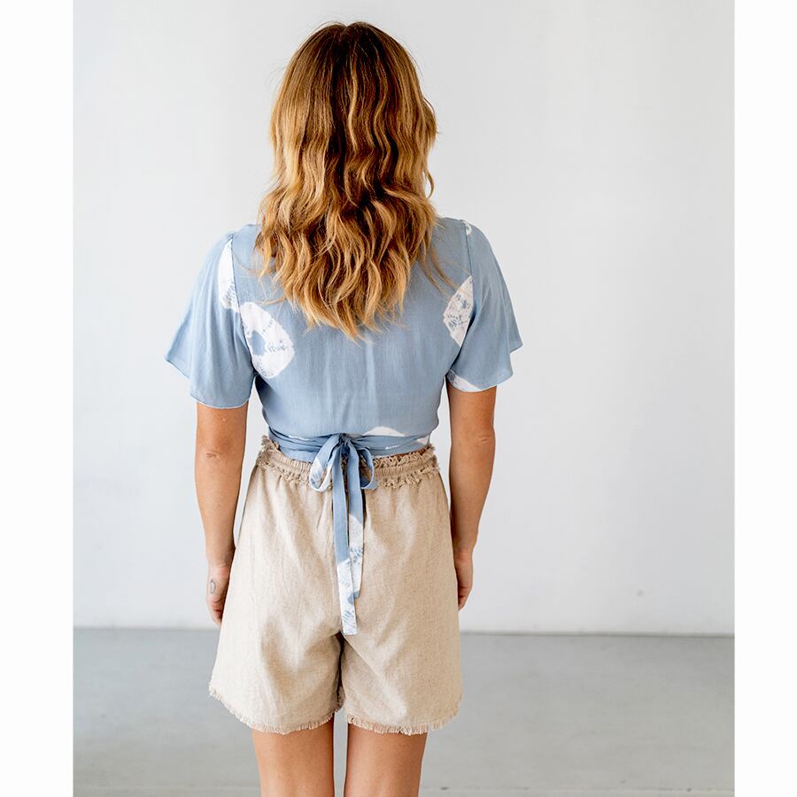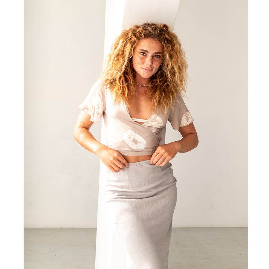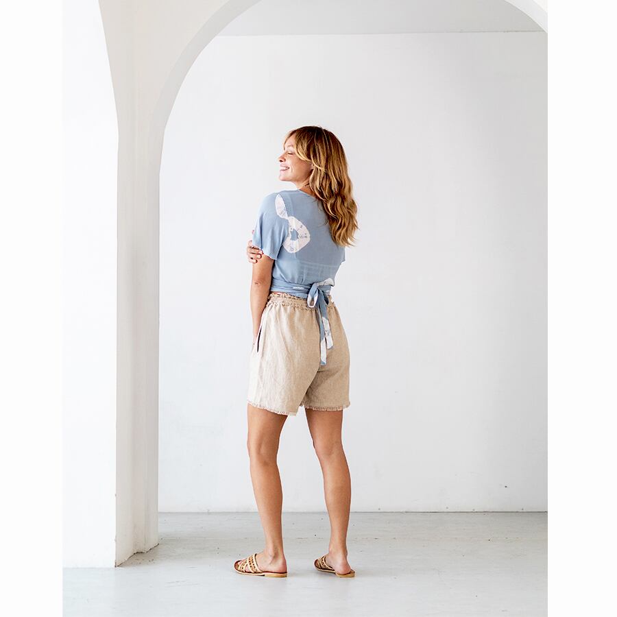 軽い生地でデザインした、このカシュクールは、コーデの主役になること間違いない。